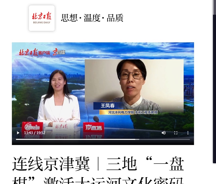 6月16日 ,《北京日报》“行走京津冀、看运河新韵”专栏刊登通讯报道《三地“一盘棋”激活大运河文化密码》,并在客户端“京直播”中视频连线我校水利贝博(中国)一站式服务官网系副主任王凤春教授,邀请其就共建大运河文化带功能进行介绍...